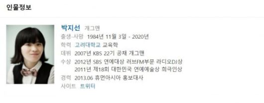 특히나 내일(3일)은 박지선의 생일. 박지선의 네이버 프로필도 출생-사망으로 변경됐다. 1984년 11월 3일 출생과, 2020년 사망으로 바뀐 프로필에 많은 이들이 애도를 전하고 있다.