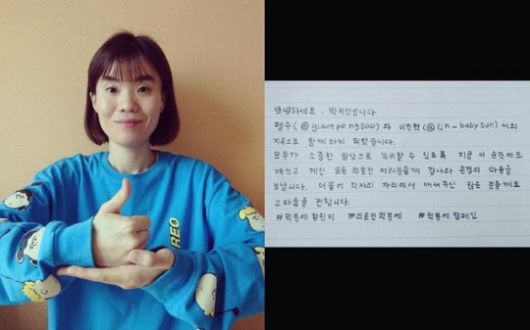 개그우먼 박지선의 ‘덕분에 챌린지’와 자필 메시지 (사진=이윤지 인스타그램)