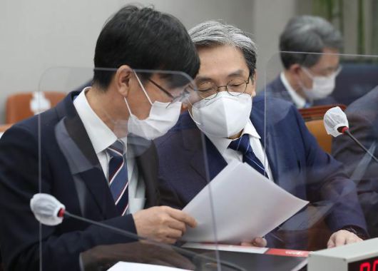 대화하는 노영민 비서실장과 김상조 정책실장 (서울=연합뉴스) 진성철 기자 = 노영민 대통령비서실장과 김상조 정책실장이 29일 오전 서울 여의도 국회 운영위원회의 청와대 대통령비서실과 대통령경호처, 국가안보실에 대한 국정감사에 출석, 대화하고 있다. 이날 국감은 서훈 국가안보실장과 김종호 민정수석 등 7명의 핵심 참모가 불출석을 통보, 11월4일로 연기됐다. 2020.10.29 jeong@yna.co.kr/2020-10-29 12:27:12/ <저작권자 ⓒ 1980-2020 ㈜연합뉴스. 무단 전재 재배포 금지.> |