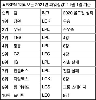 ESPN은 지난 1일(이하 한국시간) ‘2020 롤드컵’이 종료된 이후 LOL e스포츠 프로팀 파워랭킹을 공개했다. ESPN은 ‘오는 2021년 소환사의 컵에 다시 도전할 수 있는 팀’을 주제로 순위를 매겼다. 그 결과 담원이 쑤닝, TES, G2 등 내로라하는 강팀들을 모두 제치고 1위에 올랐다.