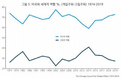 미국이 세계질서에 적극적인 역할을 해야 한다는 여론은 2015년 66.9%에서 2017년 67.3%, 2018년 71.1%, 2019년 72.7%로 오히려 상승했다.