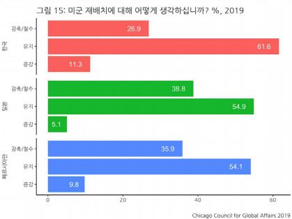 특히 한미동맹에 대해 미국인들의 지지는 강했다. 2019년 기준 한국, 일본 및 페르시아만 주둔군을 대상으로 주둔 미군의 증강·유지·감축·철군 여부를 물은 결과, 한국 주둔군을 증강하거나 유지해야 한다는 응답이 72.9%로 가장 높고 철군 응답은 26.9%로 가장 낮았다.
