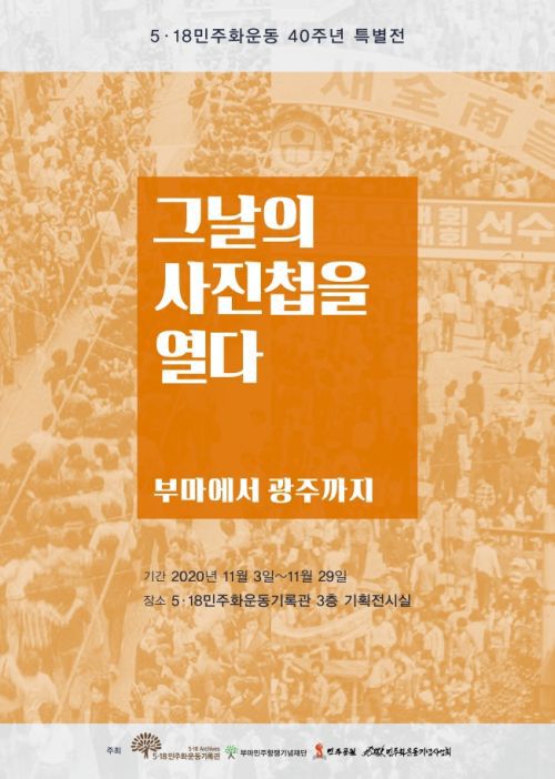 [아시아경제 호남취재본부 윤자민 기자] 광주광역시 5·18민주화운동기록관은 오는 29일까지 부마재단, 부산민주공원, 민주화운동기념사업회 등과 공동으로 5·18민주화운동 40주년 특별전 ‘그날의 사진첩을 열다 ; 부마에서 광주까지’를 개최한다고 3일 밝혔다.
