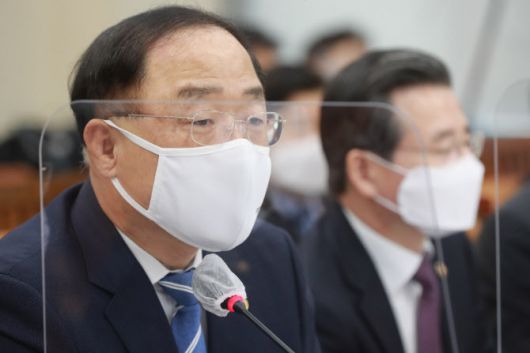 홍남기 부총리 겸 기획재정부 장관이 3일 국회에서 열린 기획재정위원회 전체회의에서 답변하고 있다.(사진=연합뉴스) |