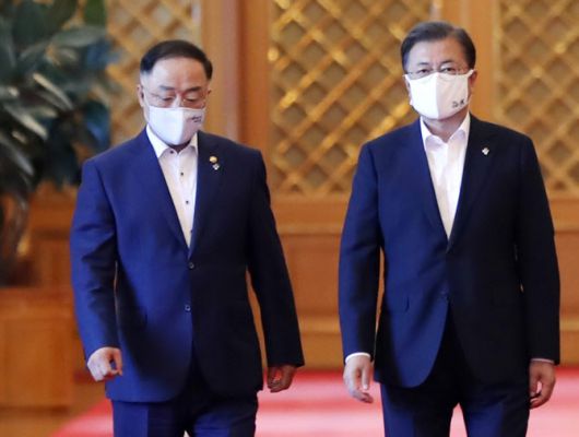 문재인 대통령(오른쪽)과 홍남기 경제부총리 겸 기재부장관(사진=연합뉴스) |