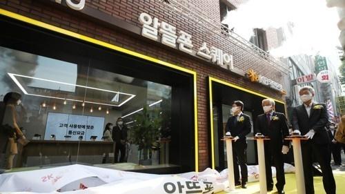 지난달 27일 서울 서대문구 알뜰폰 스퀘어에서 열린 개소식에서 장석영 과학기술정보통신부 제2차관(왼쪽부터), 김형진 한국알뜰통신사업자협회장, 박천용 KB업무지원본부장이 개소 축하 버튼을 누르고 있다. 연합뉴스 |