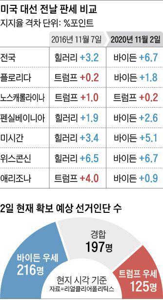 반면 트럼프 대통령은 오히려 선거 당일 자제하는 모습을 보였다. 그는 이날 낮 인근 버지니아 알링턴의 선거캠프 본부를 방문했다. 트럼프 대통령은 “우리는 오늘 멋진 밤을 보낼 것 같다”면서도 “하지만 이건 정치고 선거기 때문에 절대 알 수 없다”고 여지를 남겼다. 그러면서 “우리가 플로리다에서 매우 잘하고 있고 애리조나주에서도 매우 잘하고 있다고 들었다”며 “텍사스에서도 믿을 수 없을 정도로 잘하고 있다. 매우 기분이 좋다”고 했다.