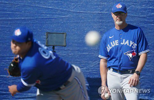 류현진의 불펜피칭을 지켜보는 피트 워커 토론토 투수코치 |