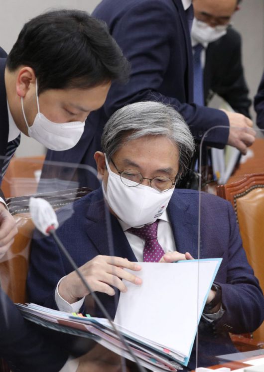 노영민 대통령 비서실장이 4일 국회운영위원회의에서 열린 대통령비서실ㆍ국가안보실ㆍ대통령경호처에 대한 국정감사에서 자료를 살펴보고 있다.(사진=연합뉴스) |