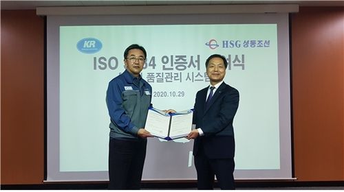 ▲ 한국선급은 최근 HSG성동조선에 용접 품질관리 시스템에 대한 국제표준인 ISO 3834 인증을 수여했다고 4일 밝혔다. ISO 3834는 금속 재료의 용접 품질 향상을 위해 국제표준화기구(ISO)가 제정한 국제표준으로, 용접 품질관리 기법에 주안점을 둔다. HSG성동조선이 취득한 인증서는 ISO 3834-2로, ISO 3834 표준 시리즈 중 가장 수준이 높다. (서울=연합뉴스)