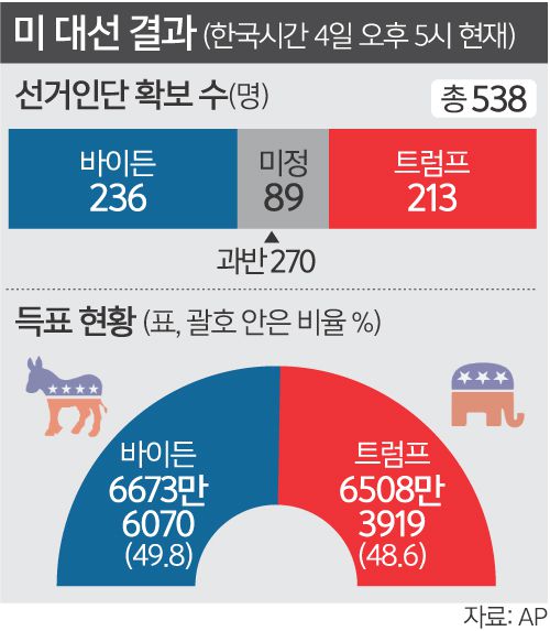 도널드 트럼프 대통령이 개표 중간에 승리를 선언하고 조 바이든 민주당 대선후보도 승리를 장담하면서 혼란이 빚어지고 있다. <관련기사 2·3·4·5·6면>