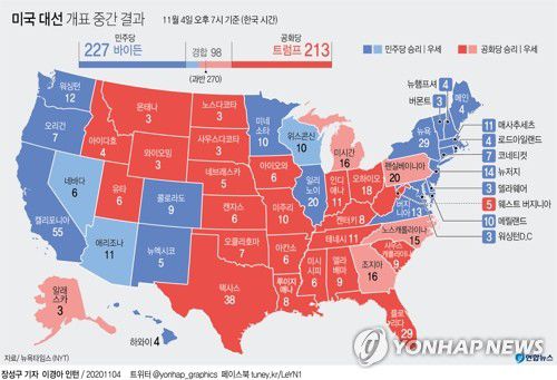(워싱턴=연합뉴스) 류지복 특파원 = 미국이 3일(현지시간) 대선을 치렀지만 개표 지연으로 당선인을 확정 짓지 못하고 있다.