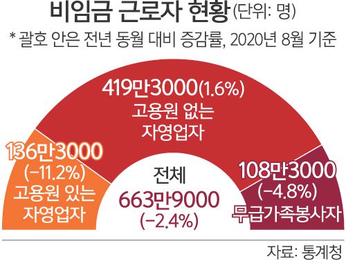 자영업자와 무급 가족종사자를 합친 ‘비임금근로자’는 올해 8월 기준 663만9000명으로 지난해 같은 달보다 2.4%(16만1000명) 감소했다. 이 가운데 고용원이 있는 자영업자는 136만3000명으로 11.2%(17만2000명)나 줄어든 반면 고용원이 없는 자영업자는 419만3000명으로 1.6%(6만6000명) 늘었다. 고용원 있는 자영업자에게 코로나19에 따른 고용한파가 불어닥친 것이다.
