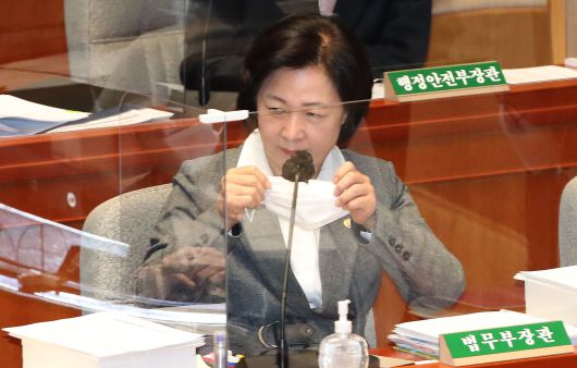추미애 법무부장관이 4일 국회에서 열린 예산결산특별위원회 전체회의에 출석해 마스크를 고쳐 쓰고 있다./이덕훈 기자 |