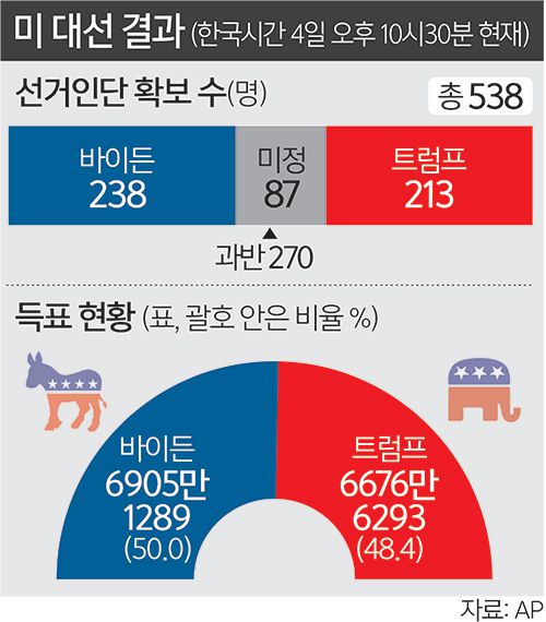 오전 8시30분(한국시간 4일 오후 10시30분) 현재 조 바이든 민주당 대선후보는 전국 득표에서 6905만1289표를 얻어, 6676만6293표를 얻은 트럼프 대통령에게 228만4996표 앞서 있다. 하지만 미 대선은 승자가 주별 선거인단을 모두 가져가는 승자독식 방식이다. 전체 538명의 선거인단 가운데 270명을 확보하면 승리하는데, 트럼프 대통령과 바이든 후보는 각각 213명과 238명을 확보한 상태다.