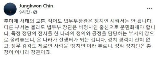 진 전 교수는 지난 4일 자신의 페이스북에 "추미애 사태의 교훈"이라며 이같이 말했다. 그는 "다른 부서는 몰라도 법무부 장관은 비정치인 출신으로 문민화해야 한다"고 강조했다.