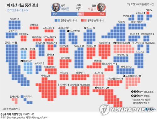 조 바이든 민주당 후보가 북부 경합지인 미시간주, 위스콘신주에서 초반 우위를 뒤집어 현재 기준 총 264명의 선거인단을 확보했기 때문이다.