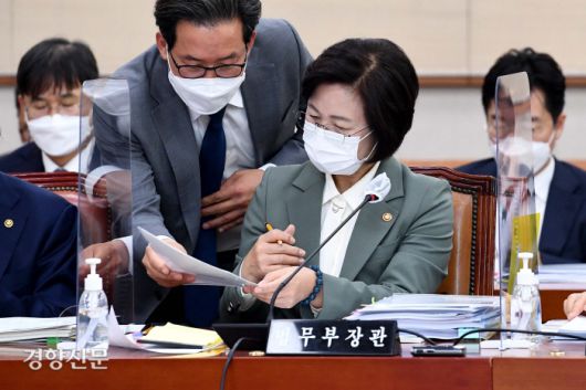 추미애 법무부 장관이 5일 서울 여의도 국회에서 열린 법제사법위원회 전체회의에서 심재철 검찰국장의 보고를 받고 있다. 김영민 기자 |
