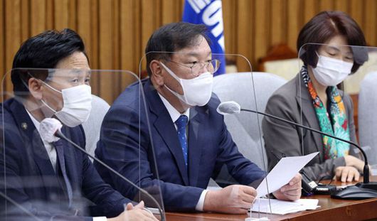 정책조정회의 주재하는 김태년 - 김태년(가운데) 더불어민주당 원내대표가 5일 서울 여의도 국회에서 열린 당 정책조정회의에서 발언하고 있다. /국회사진기자단 |