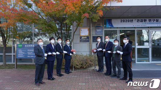 정병선 과학기술정보통신부 제1차관(왼쪽 열에서 바깥쪽에서부터 네 번째)과 윤충식 서울대학교 보건대학원 산업환경보건연구실 교수(오른쪽 열에서 바깥쪽에서부터 세 번째) 등이 지난 4일 서울 관악구 소재 서울대 보건대학원 앞에서 '건강한 연구실' 현판식을 진행하고 있다. (서울대학교 제공) 2020.11.4/뉴스1 |