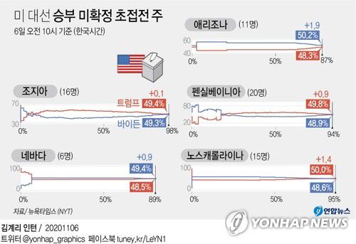 CNN 방송은 이날 현재 판세가 결정되지 않은 주로 펜실베이니아, 노스캐롤라이나, 조지아, 네바다, 애리조나, 알래스카 등 6곳을 꼽았다.