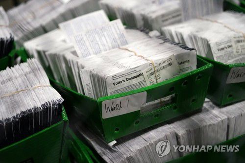 대선 우편투표 용지 분류하는 미국 선거관리 요원들 |