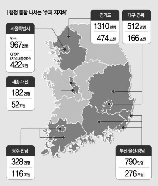광역지자체의 통합은 통합을 통해 수도권에 비해 위축되고 있는 인구와 경제력을 확대시키고자 하는 노력의 일환으로 진행되고 있다. 대구ㆍ경북의 통합이 실현될 경우 인구는 510만명, 지역내총생산(GRDP)은 165조원에 이르는데 이는 경기(1324만명ㆍ473조원)와 서울(973만명ㆍ422조원)에 이어 세 번째로 큰 규모다. 광주ㆍ전남 역시 통합이 이뤄질 경우 인구는 328만명, GRDP는 115조원에 이르게 된다. 통합을 통해 활용할 수 있는 예산 규모를 증가시킴과 동시에 더욱 광역적 차원의 사업을 통해 지역의 발전을 도모하고자 하는 이러한 노력은 실제로 지방의 상황이 매우 급박하게 열악해지고 있음을 보여주고 있기도 하다.