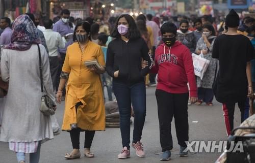 인도 수도 뉴델리에서 마스크를 쓰고 걷고 있는 주민. [신화=연합뉴스] |