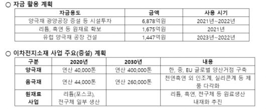 확보한 자금은 양극재 광양공장 증설 등의 시설투자에 6900억 원, 흑연과 리튬 등의 원재료 확보에 1600억 원을 사용될 예정이다. 또한, 전기차 수요가 급증하고 있는 유럽 양극재 생산공장 건설에도 1500억 원이 투입된다.