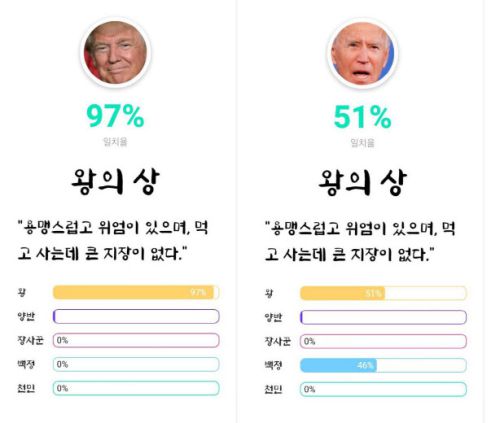 AI는 트럼프 대통령에 대해 왕의 상과 97%의 일치율을 보인다고 판단했다. 바이든 후보는 51%로 나타났는데, ‘백정’과의 일치율이 46%나 돼 눈길을 끈다.