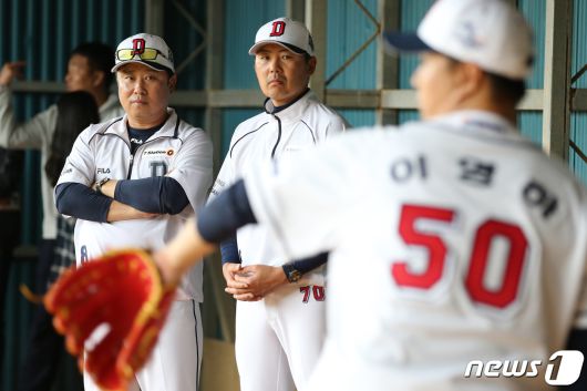2019년 스프링캠프에서 이영하의 투구를 지켜보는 김태형 감독과 김원형 당시 투수코치. (두산 베어스 제공) © 뉴스1 |