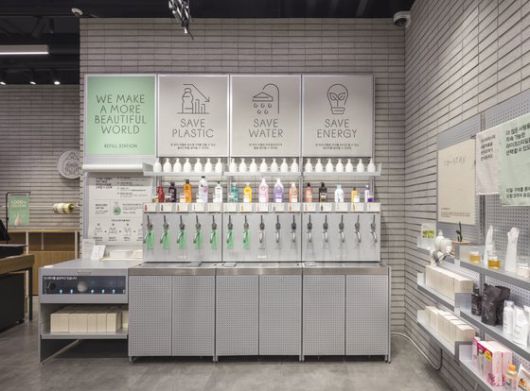 비닐 포장이나 플라스틱 용기 없이 내용물만 구매할 수 있는 '리필' 숍이 하나씩 문을 열고 있다. 사진은 아모레퍼시픽이 운영하고 있는 '리필 스테이션.' 사진 아모레퍼시픽