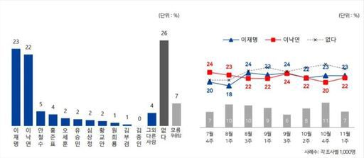 엠브레인퍼블릭·케이스탯리서치·코리아리서치·한국리서치 등 여론조사 전문업체 4개사가 지난 5일부터 7일까지 전국 만 18세 이상 남녀 1002명을 대상으로 조사해 8일 발표한 11월 1주차 대선후보 적합도 조사에 따르면, 이재명 경기지사는 23%를 기록했다.