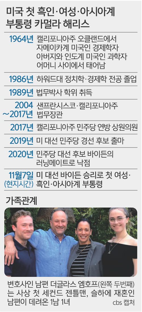 해리스는 자체로 역사가 됐다. 미국의 첫 번째 여성 부통령이자 흑인 부통령, 아시아계 부통령이라는 3가지 기록을 당선과 동시에 세웠기 때문이다. 그는 캘리포니아주 오클랜드에서 자메이카인 아버지와 인도인 어머니 사이에서 태어났다. 나렌드라 모디 인도 총리는 트위터에 해리스 당선인에 대해 “당신의 성공은 새로운 길을 열었다(pathbreaking)”며 “당신의 치티(chittis·타밀어로 이모나 고모)뿐 아니라 모든 인도계 미국인들의 자부심”이라고 축하했다.