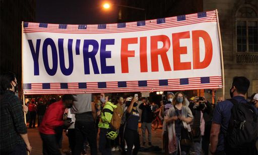 조 바이든 민주당 대선후보의 대선 승리 소식이 전해진 7일(현지시간) 백악관 앞에 등장한 '당신 해고야' 현수막. 워싱턴=연합뉴스 |