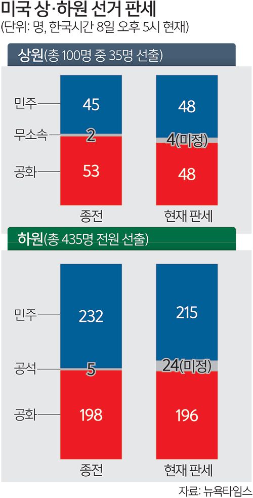 한편 하원에서는 민주당이 215석을 확보해 아직 결과가 나오지 않은 24곳 가운데 4곳만 이기면 다수당이 된다. 하지만 기존 232석보다 의석수를 늘릴 것이라는 당초 예상이 빗나가면서 낸시 펠로시 하원의장의 리더십이 위태로워졌다고 미 언론들은 전했다.