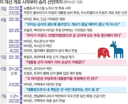 3일 0시 뉴햄프셔주 산골마을 딕스빌 노치에서 첫 투표가 시작되고 오후 6시부터 시작된 개표 초반 6대 경합주 중 선거인단이 가장 많은 플로리다(29명)에 세계인의 시선이 쏠렸다. 바이든 후보가 이기면 백악관행이 다가오고, 트럼프 대통령이 이기면 4년 전 승리를 재연할 수 있기 때문이다.
