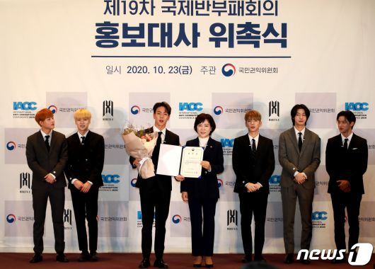 전현희 국민권익위원장이 23일 서울 강남구 코엑스에서 그룹 몬스타엑스에게 '제19차 국제반부패회의(IACC)' 홍보대사 위촉장을 수여하고 있다. (국민권익위원회 제공) 2020.10.23/뉴스1 |