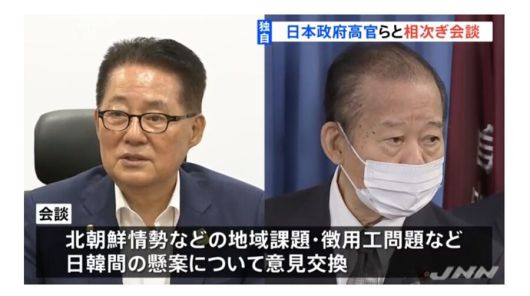 일본 민영방송 <티비에스>(TBS)는 “박지원 원장이 이르면 10일 총리관저에서 스가 총리를 예방하는 것을 최종 조율 중”이라고 9일 보도했다. 그는 전날 오랜 친분이 있는 니카이 도시히로 자민당 간사장도 만났다. 니카이 간사장은 스가 요시히데 총리의 최측근으로 박 원장과 20년 가까이 교류해 친분이 두터운 것으로 알려져 있다. 강제동원 피해자, 수출규제 등 한-일 현안에 대해 속내를 드러내며 폭넓게 대화를 나눴을 것으로 보인다.
