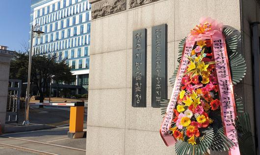 9일 청주지검 정문 앞에는 ‘대한민국 법치 바로 잡아주세요’, ‘대한민국 검사님 권력을 남용하는 기생충 박멸하여 주십시요’라는 글귀가 적힌 화환이 놓였다.