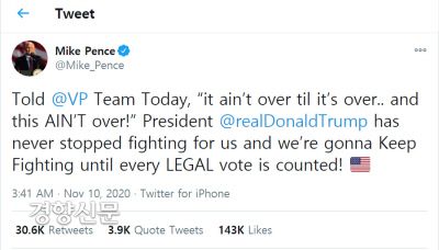 트럼프 행정부 2인자인 펜스 부통령은 이날 트위터에서 “끝날 때까지 끝난 게 아니다. 이건 끝나지 않았다”며 “트럼프 대통령은 우리를 위해 싸우는 것을 멈추지 않았고, 우리는 모든 합법적인 투표가 집계될 때까지 계속 싸울 것”이라고 했다. 펜스 부통령은 대선 다음날인 4일 오후부터 공개석상에 모습을 드러내지 않고 있다. 미국 언론들은 차기 대선을 노리는 그가 대선 패배 후 의도적으로 트럼프 대통령과 거리를 두고 있다고 해석했다.