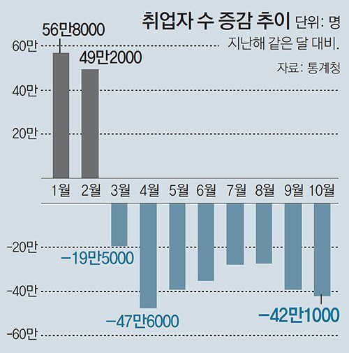 지난달 취업자 수가 1년 전보다 42만1000명 줄어 6개월 만의 최대 폭으로 감소했다. 실업자가 두 달째 100만 명을 넘기면서 지난달 실업률은 10월 기준으로 20년 만의 최고치였다.