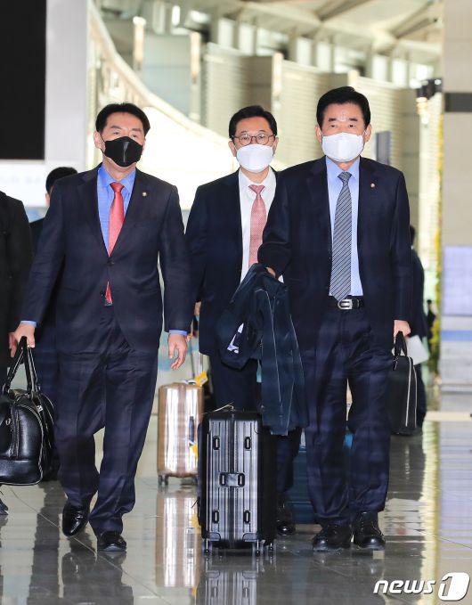 (인천공항=뉴스1) 구윤성 기자 = 김진표, 김석기 의원을 비롯한 한일의원연맹 소속 위원들이 스가 요시히데(菅義偉) 일본 총리를 만나기 위해 12일 오전 인천국제공항을 통해 출국하고 있다.