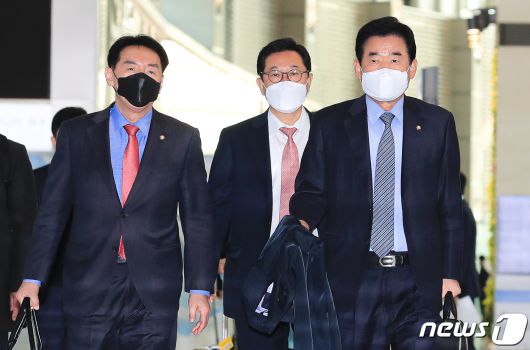 (인천공항=뉴스1) 구윤성 기자 = 김진표, 김석기 의원을 비롯한 한일의원연맹 소속 위원들이 스가 요시히데(菅義偉) 일본 총리를 만나기 위해 12일 오전 인천국제공항을 통해 출국하고 있다.