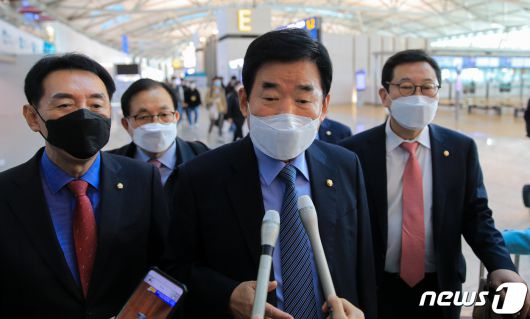 (인천공항=뉴스1) 구윤성 기자 = 김진표, 김석기 의원을 비롯한 한일의원연맹 소속 의원들이 스가 요시히데(菅義偉) 일본 총리를 만나기 위해 12일 오전 인천국제공항을 통해 출국하기 전 취재진의 질문에 답하고 있다.