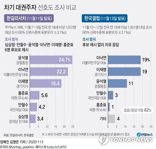 반면 한길리서치 조사에서는 심상정·안철수·윤석열·이낙연·이재명·홍준표 등 6명만 후보로 제시했다.
