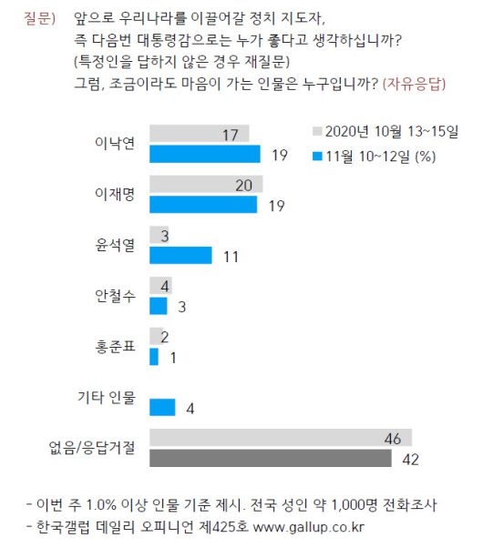 한편 차기 대통령감으로 선호하는 인물을 묻는 질문에는 이낙연 더불어민주당 대표와 이재명 경기도지사가 각각 19%로 동률을 나타냈다. 윤석열 검찰총장은 11%였다. 전달 3%보다 8%포인트 확대된 수치다.