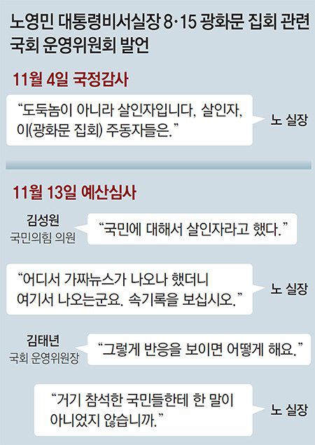 국민의힘 배현진 의원은 노 실장을 향해 “대통령을 곁에서 지켜야 하는 분이 저급한 길바닥 언어 같은 날카로운 언어로 말한 것에 대해 많은 국민이 충격을 받았다”며 “(살인자) 그 발언이 틀렸나, 과했나”라고 물었다. 노 실장은 4일 청와대 국정감사에서 보수단체의 광복절 광화문 집회와 관련해 “집회 주동자들은 도둑놈이 아니라 살인자”라고 말한 바 있다.