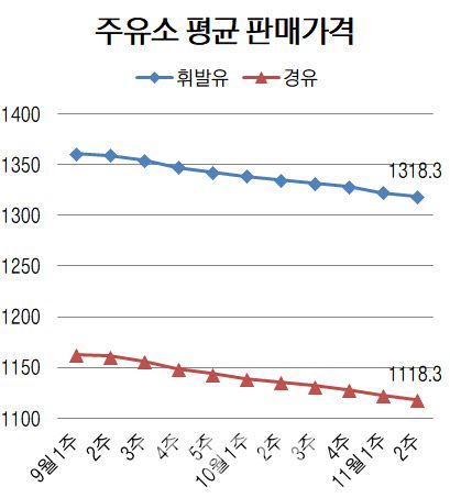 전국 주유소 휘발유 평균 판매가격은 개별 주유소 판매가격의 합을 전체 주유소 개수로 나눈 값이다. 휘발윳값은 8월 이후 하향 곡선을 그리고 있다.