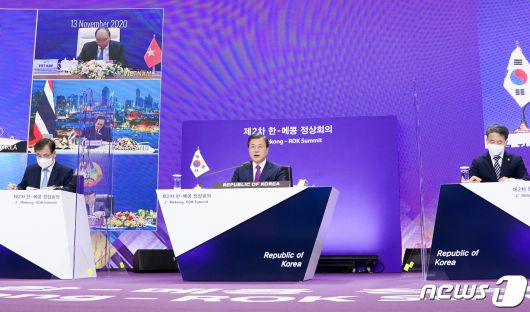 (서울=뉴스1) 최은지 기자 = 문재인 대통령은 14일 오후 화상으로 개최된 제23차 아세안(ASEAN)+3(한중일) 정상회의에서 스가 요시히데(菅義偉) 일본 총리와 처음으로 다자회의에서 만났다.